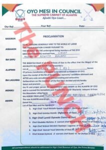 In the document signed by the Oyomesi (kingmakers), the name of Prince Lukuman Adelodun Gbadegesin was written as the Alaafin.