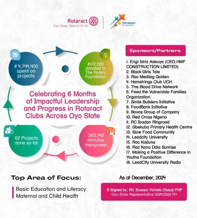 For further details, the accomplishments were officially endorsed by Rtr. Damilola Juliana Oni, Secretary, Rotaract Oyo State, on behalf of Rtr. Busayo Victoria Olusoji, PHF, the Oyo State Representative for the 2024/2025 Rotary Year.