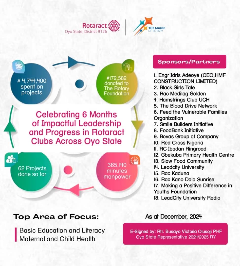 _Over the past six months, Rotaract Clubs in Oyo State has continued to drive impactful change through its dedication to service and leadership development. Here’s a summary of our remarkable achievements so far:_