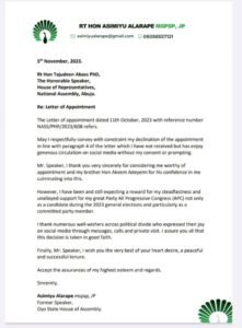 Home Uncategorized JUST IN: Ex-Oyo Speaker, Alarape, Rejects Appointment As Speaker’s SLA Uncategorized JUST IN: Ex-Oyo Speaker, Alarape, Rejects Appointment As Speaker’s SLA By editor - November 5, 2023 2665 0 FacebookTwitterPinterestWhatsApp Asimiyu Alarape, a former speaker of the Oyo State House of Assembly has rejected his appointment as senior legislative aide to speaker of the House of Representatives, Tajudeen Abass.