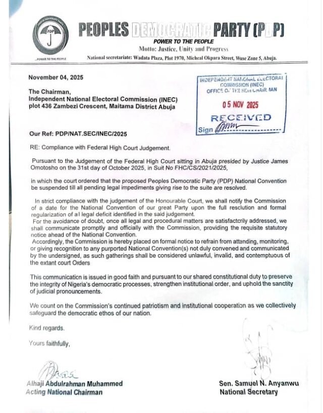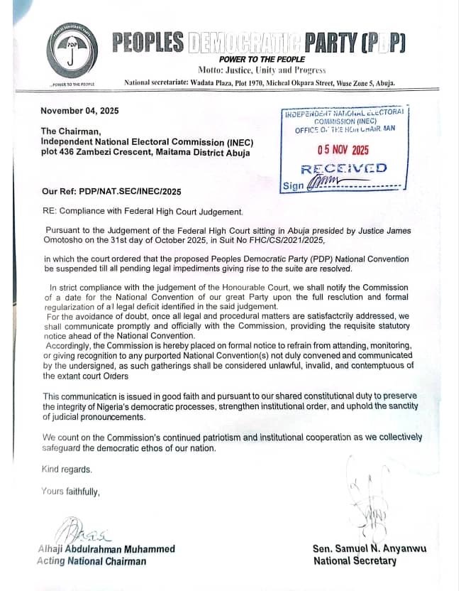 The National Leadership of the PDP, under my humble leadership as Acting National Chairman Alhaji Abdulrahman Muhammed, in collaboration with our National Secretary, Distinguished Senator Samuel Anyanwu, hereby formally informs the Nigerian public that we have received the Certified True Copy (CTC) of the recent judgment of the Federal High Court, Abuja, delivered by Honourable Justice Omotosho in Suit No. FHCIABJ/CS/2120/2025.