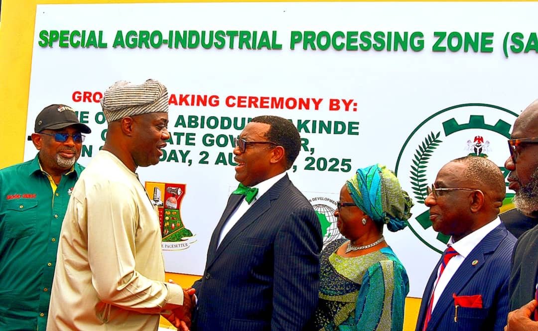 Vice-President of the Federal Republic of Nigeria, Senator Kashim Shettima, President of the African Development Bank (AfDB), Dr Akinwumi Adesina and the governor of Oyo State, ‘Seyi Makinde, on Saturday, turned the sod for the Oyo State Agribusiness Industrial Hub, Ijaiye, under the Special Agro-Industrial Processing Zone.